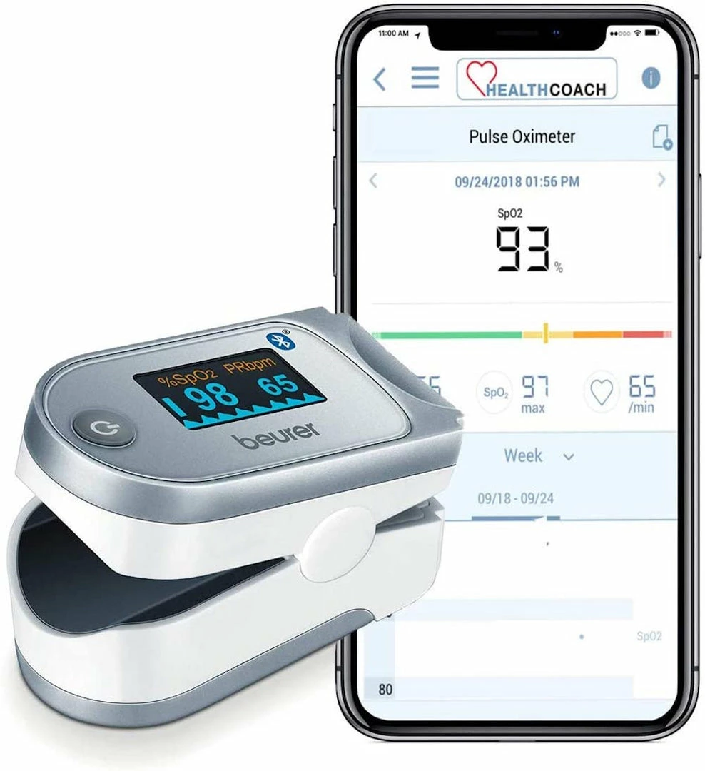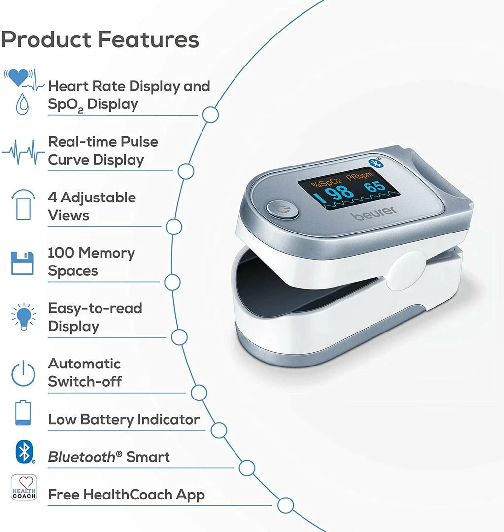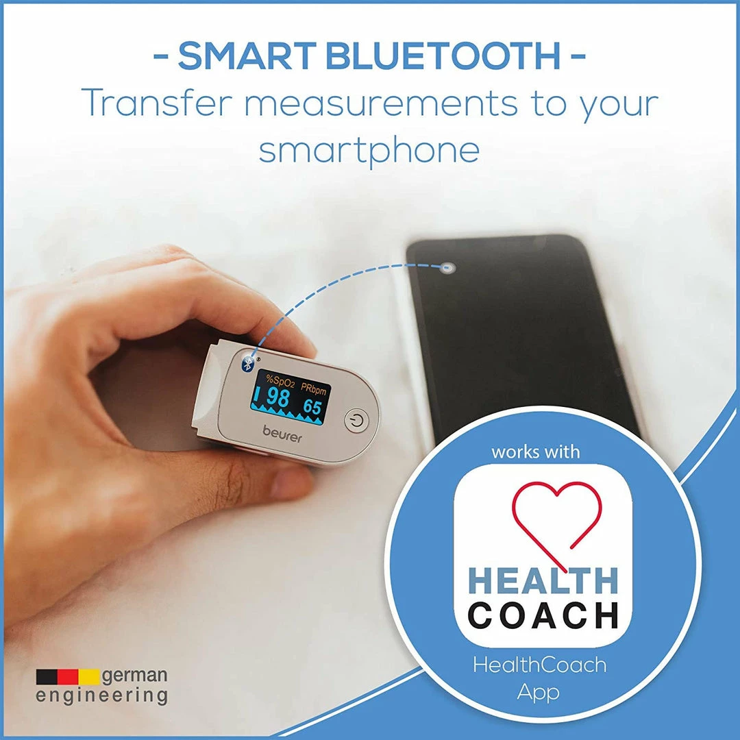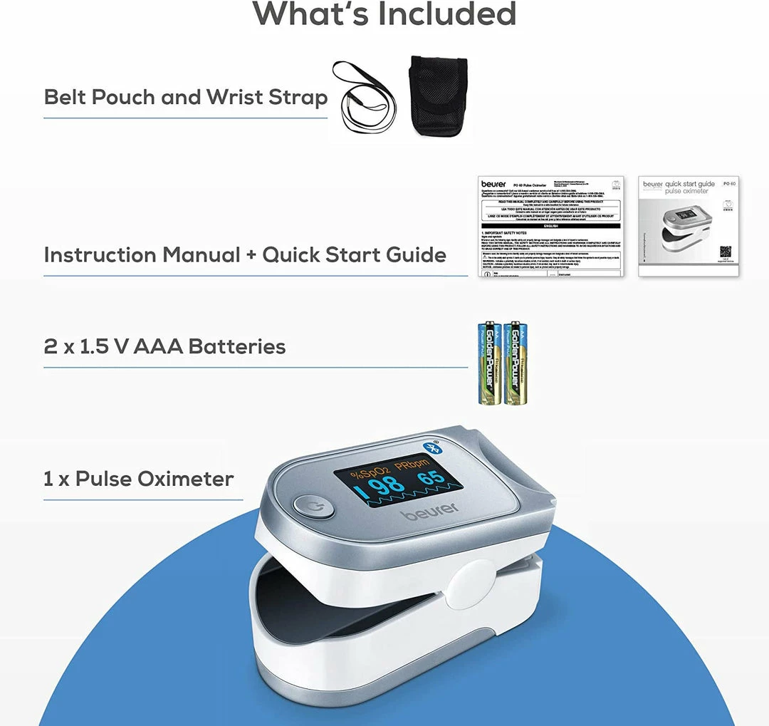 - ACCESSORIES INCLUDED – The Bluetooth Fingertip Pulse Oximeter, PO60 includes batteries, retaining strap and a belt pouch. Beurer HealthCoach app is available for free download.