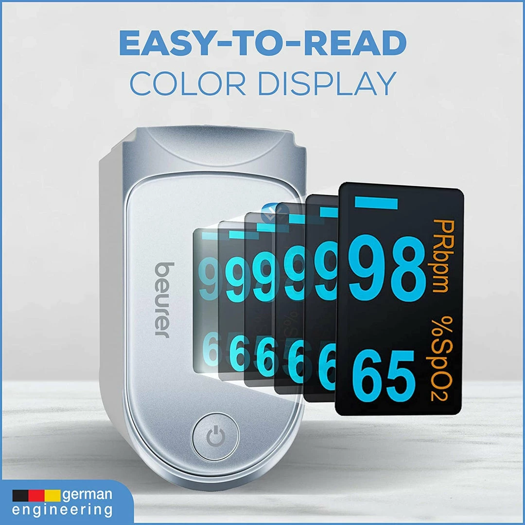 - EASY TO USE – The Beurer Pulse Oximeter, PO60 is easy and practical to use, as the device provides 100 memory spaces, large colored display with adjustable brightness and orientation, 4 graphic display formats, auto switch-off, and low battery indicator.