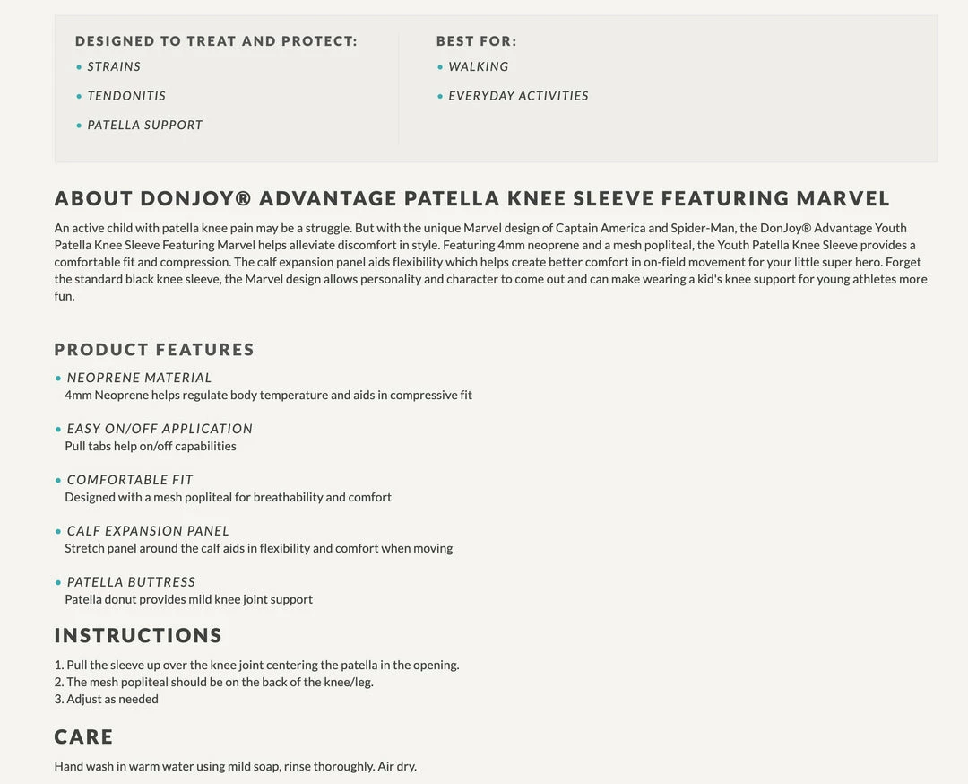 Patella knee pain may be a struggle for kids, but with the unique Marvel design, the DonJoy Advantage Patella Knee Sleeve Featuring Marvel helps alleviate discomfort in style. Featuring 4mm neoprene and a mesh popliteal, the Patella Knee Sleeve helps provide a comfortable fit and compression. The calf expansion panel aids flexibility which helps create better comfort in on-field movement. Forget the standard black children’s knee sleeve, the Marvel design allows personality and character to come out and can make wearing a youth knee support more fun. Choose from Spider-Man or Captain America designs.