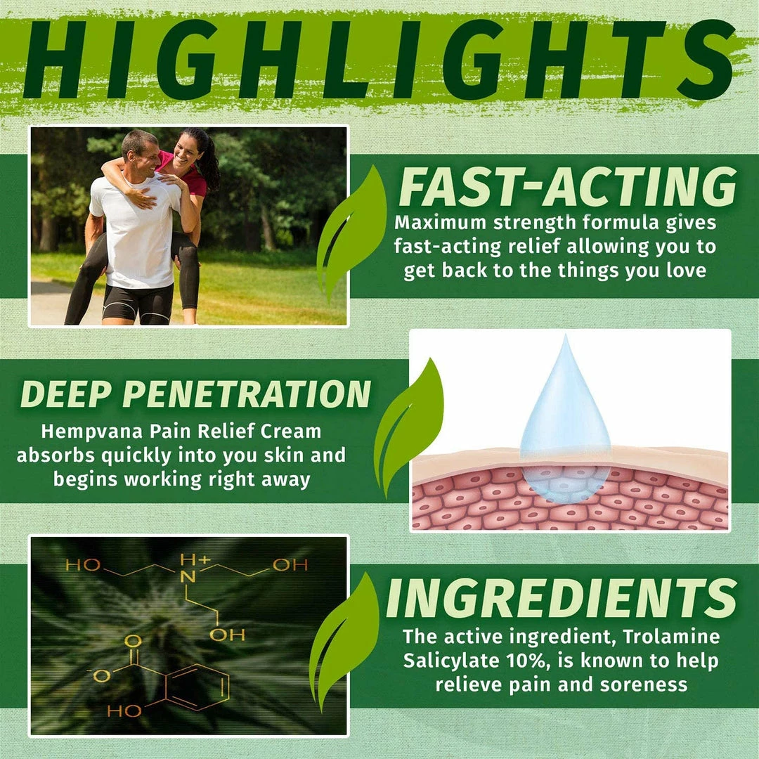 - FAST-ACTING FORMULA: when you’re looking for lasting hemp cream pain relief, look no further than Hempvana Pain Relief Cream – fast-acting formula absorbs quickly and goes to work fast.