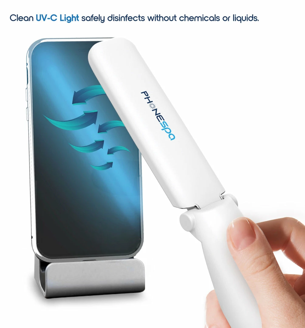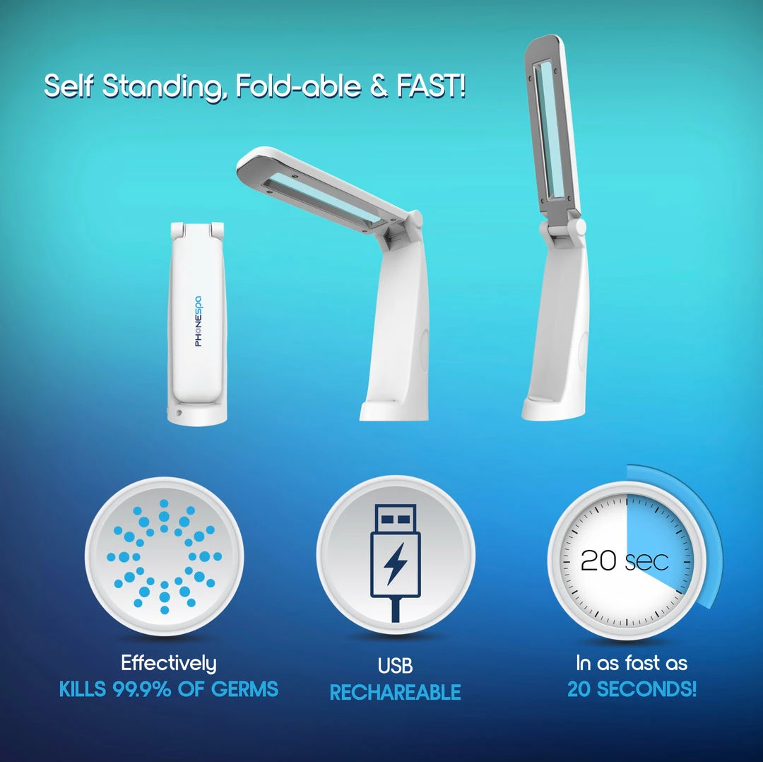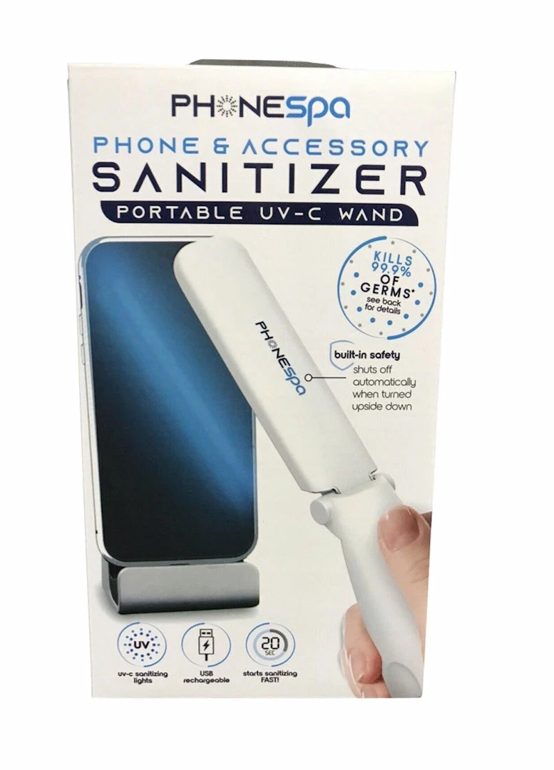The PhoneSpa handheld portable UV light sanitizer is a compact device that instantaneously kills germs and bacteria without the hassle of cleaning wipes or detergents. Its laboratory proven to kill 99.9 % of germs and bacteria in less than a minute. The handheld sanitizer can disinfect an array of items such as iPads, remote control, laptops, doorknobs, bed sheets, steering wheels, toilet covers and much more. Its powerful ultraviolet technology instantly kills bacteria and microscopic germs on any surface without leaving any harmful residues or odors. As a safety measure, the wand includes an internal mechanism that turns it off when the UV light radiates upwards. Its unique design allows you to disinfect objects in two ways by passing the sanitizing wand as close as possible and no more than one half inch above the object’s surface or through the stand-alone position which allows the UV light to penetrate the object for 10 minutes. Its simple foldable design allows you to carry it anywhere on the go, it easily fits in your purse or luggage ideal for use while travelling. Micro USB charging allows you to conveniently charge it from any power source. IMPORTANT SAFETY INFORMATION: UV-C Light is safe on any surface other than human DO NOT USE TO STERILIZE HANDS OR SKIN AS IT MAY CAUSE SKIN IRRITATION. KEEP AWAY FROM EYES.