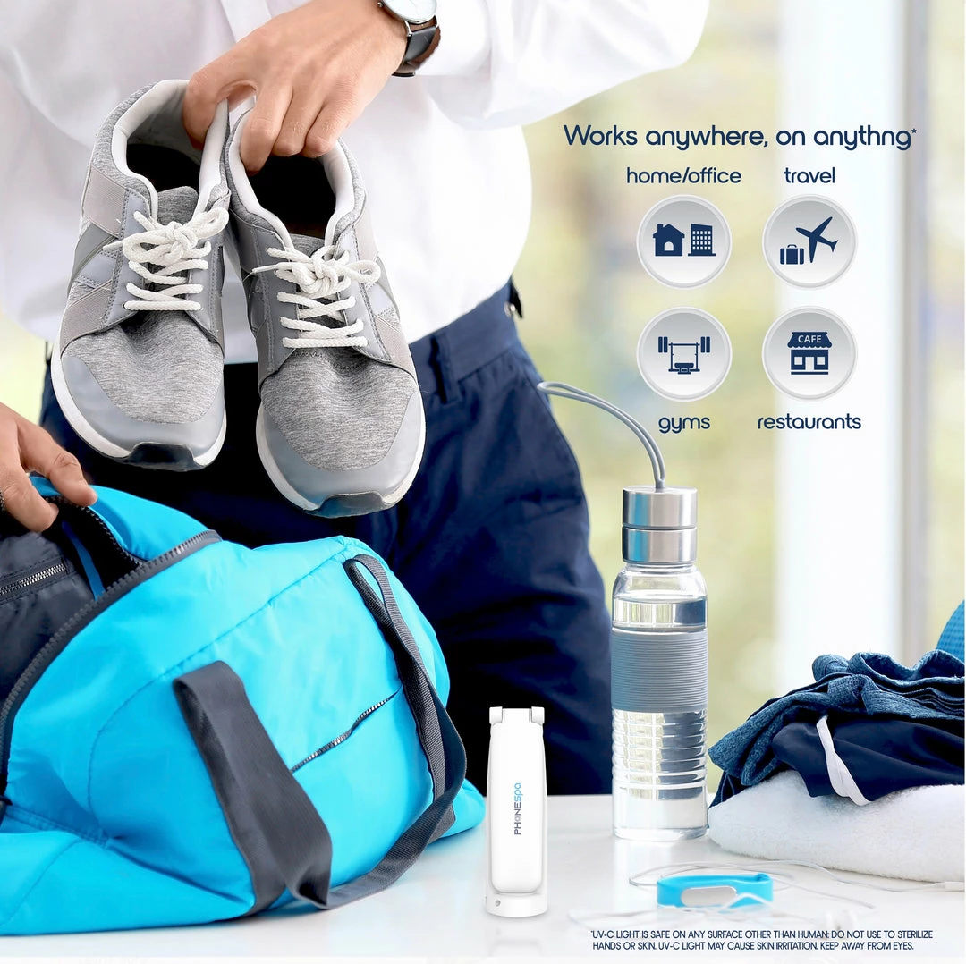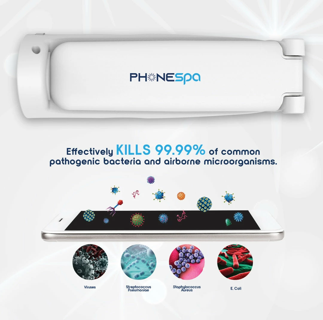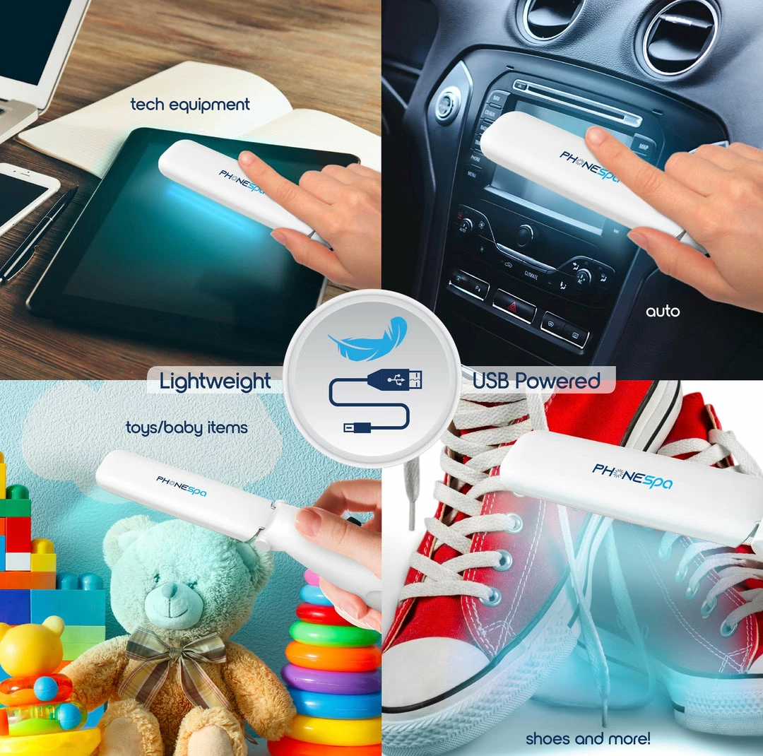 The PhoneSpa handheld portable UV light sanitizer is a compact device that instantaneously kills germs and bacteria without the hassle of cleaning wipes or detergents. Its laboratory proven to kill 99.9 % of germs and bacteria in less than a minute. The handheld sanitizer can disinfect an array of items such as iPads, remote control, laptops, doorknobs, bed sheets, steering wheels, toilet covers and much more. Its powerful ultraviolet technology instantly kills bacteria and microscopic germs on any surface without leaving any harmful residues or odors. As a safety measure, the wand includes an internal mechanism that turns it off when the UV light radiates upwards. Its unique design allows you to disinfect objects in two ways by passing the sanitizing wand as close as possible and no more than one half inch above the object’s surface or through the stand-alone position which allows the UV light to penetrate the object for 10 minutes. Its simple foldable design allows you to carry it anywhere on the go, it easily fits in your purse or luggage ideal for use while travelling. Micro USB charging allows you to conveniently charge it from any power source. IMPORTANT SAFETY INFORMATION: UV-C Light is safe on any surface other than human DO NOT USE TO STERILIZE HANDS OR SKIN AS IT MAY CAUSE SKIN IRRITATION. KEEP AWAY FROM EYES.