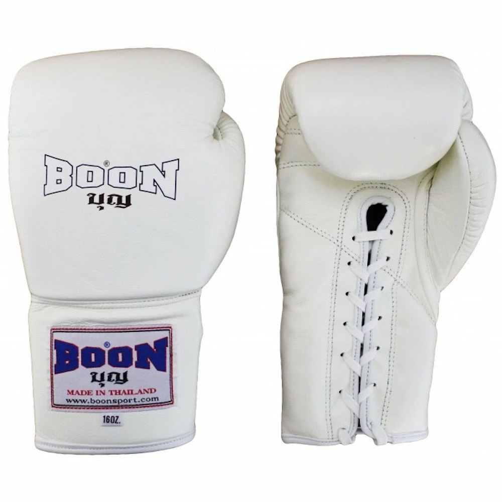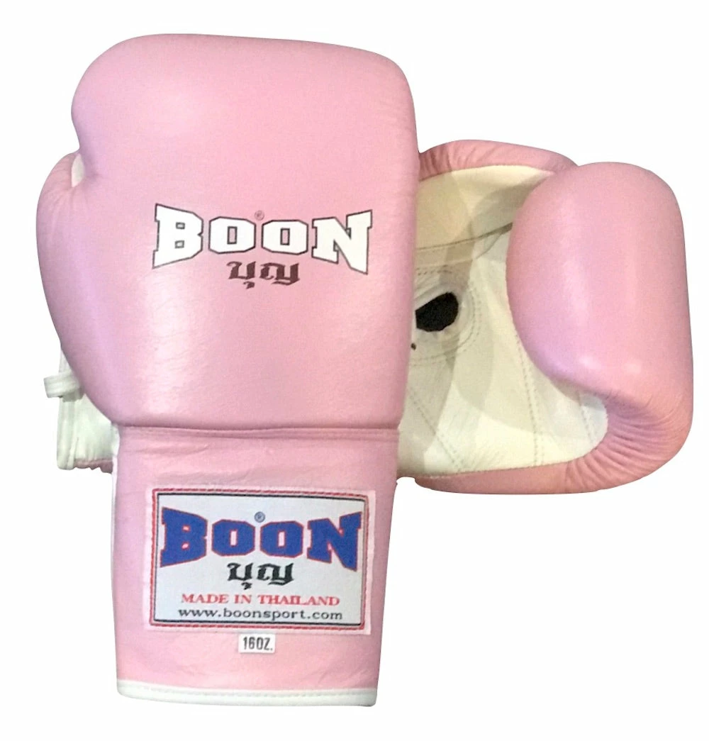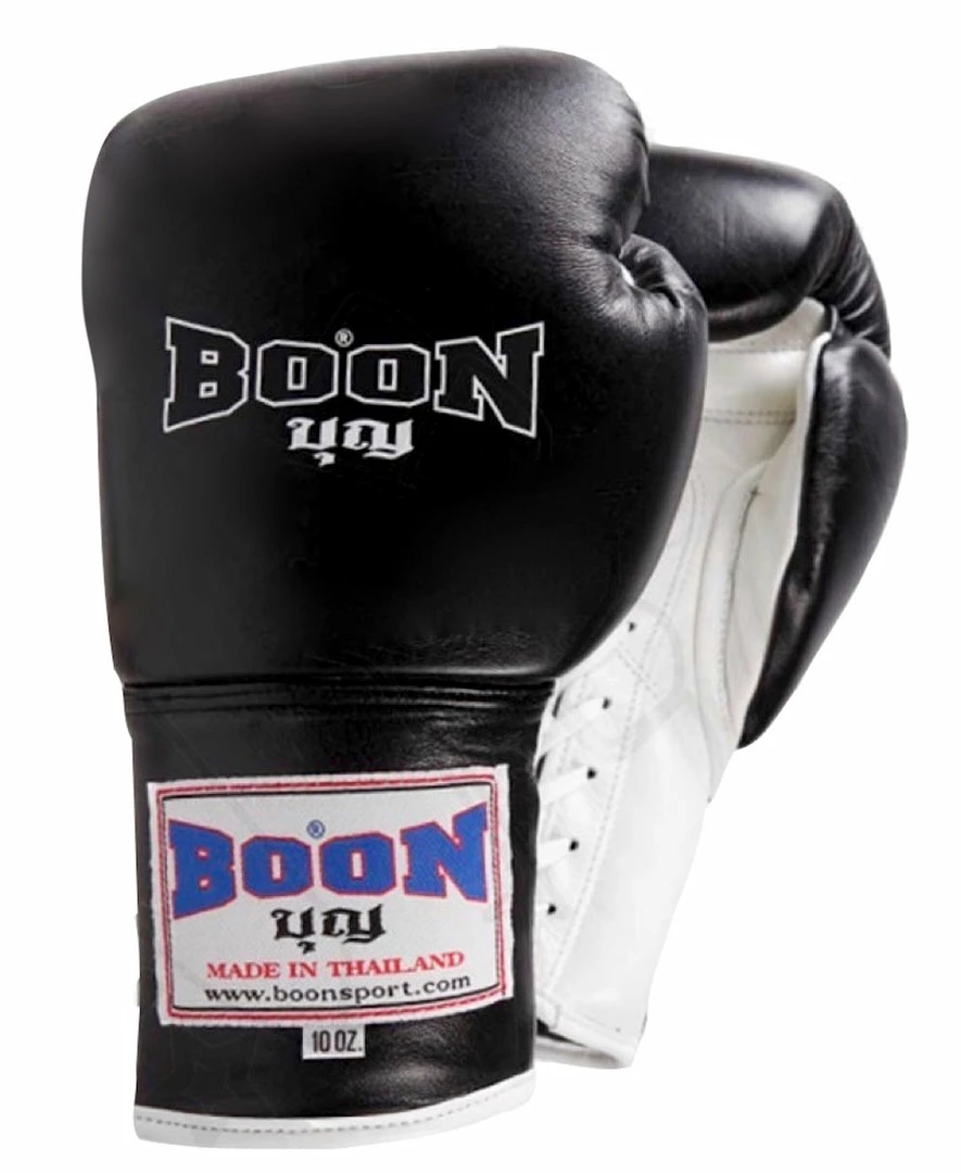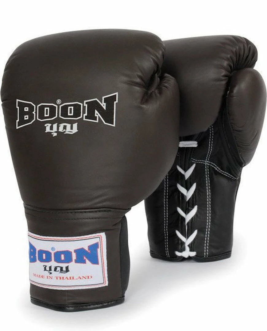 Boon competition lace-ups are a professional standard glove from Muay Thai brand Boon. Made in Thailand, these lace-ups have great wrist support and are suitable for fighters looking for a better standard of glove. With an extra-long cuff for better fastening and a 100% cowhide leather construction, these will last a long time and are extremely durable. A great blend of hand protection as well as a great ‘punch’ for competition.