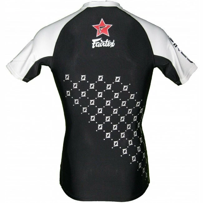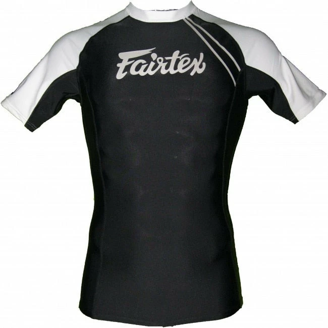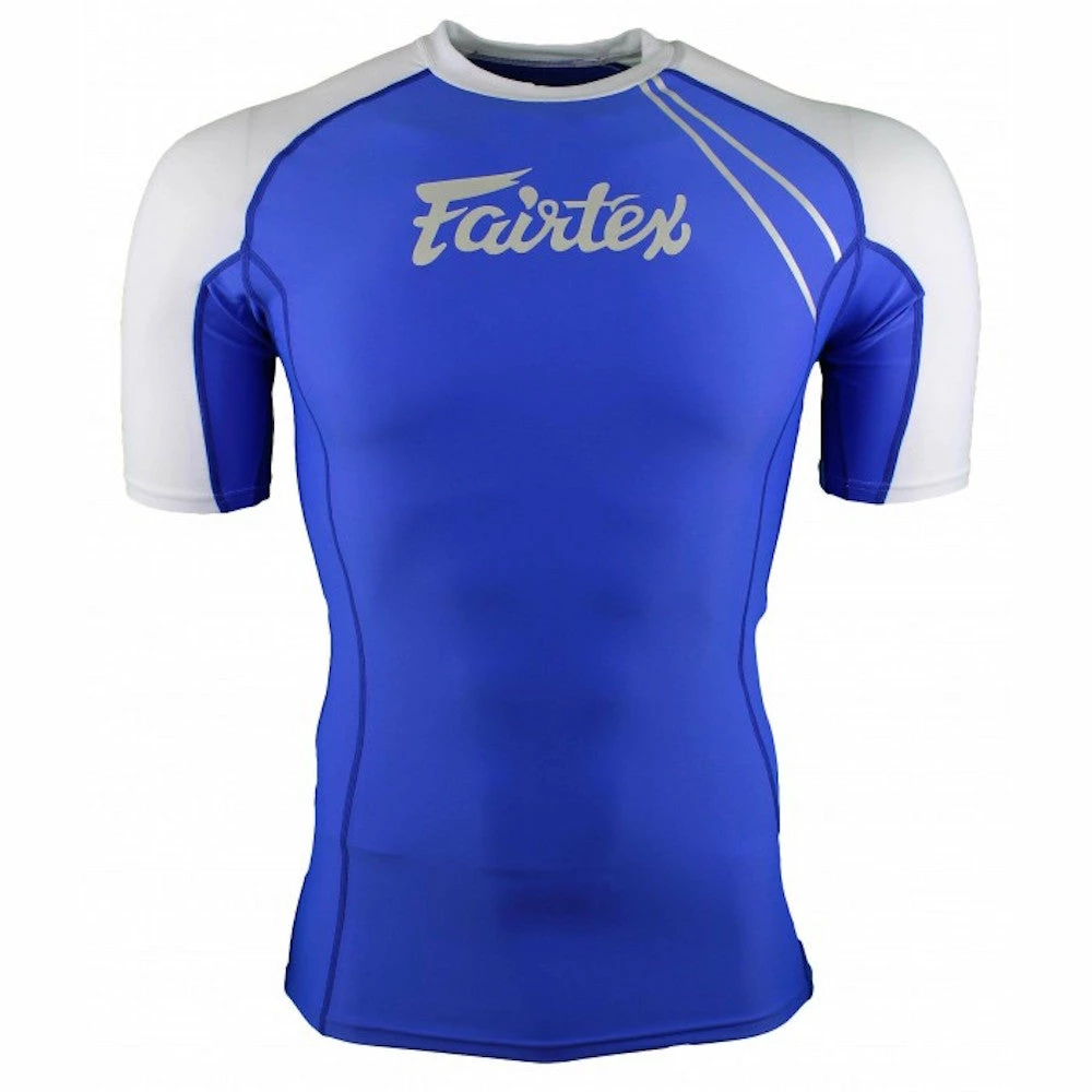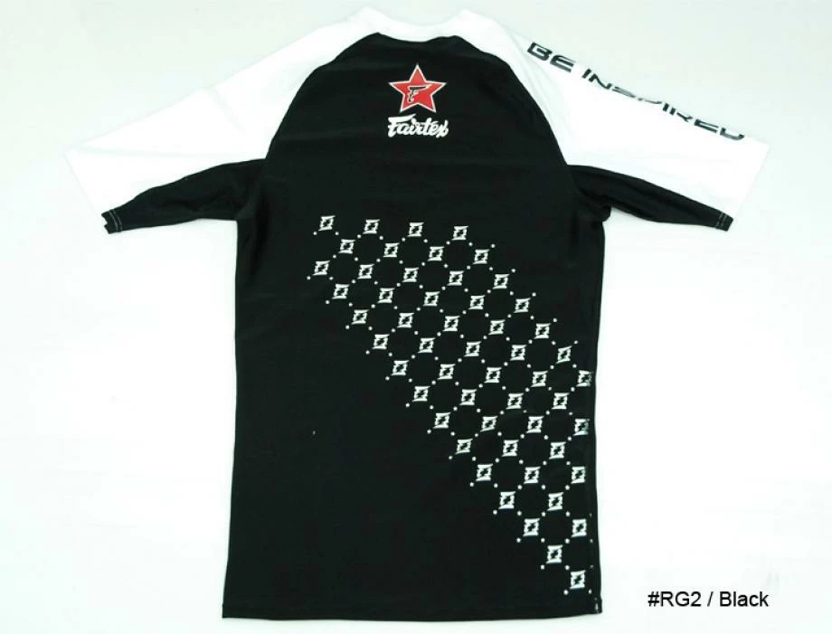 - This Fairtex Shortsleeve Rashguard is either BLACK or BLUE with WHITE along the sides/neck. It has the “Fairtex” fused on the upper chest with the words “Be Inspired” down the Right Sleeve. It also Features the “Double F” Logo fused in a pattern on the back of the Rashguard along with the Red Star Symbol.