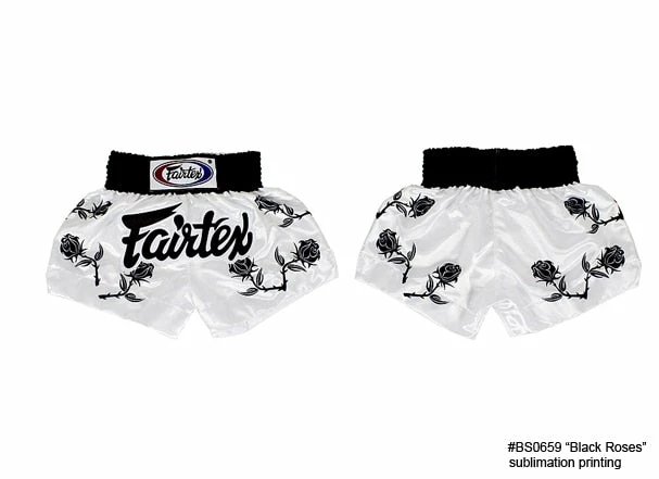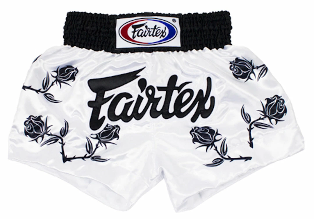 These Fairtex “BLACK ROSES” MUAY THAI KICKBOXING SHORTS are 100% SATIN and and feature SUBLIMATION PRINTING. They are DURABLE and COMFORTABLE. The shorts are WHITE color. With the famous Fairtex logo across the front of the garment, you cannot go wrong. They are quite Popular in the Muay Thai and Kickboxing world because of their look and comfort. deep waistband and typically excellent quality. Fairtex have been producing Muay Thai equipment since 1993 and are well known in the sport as a brand who put development and style at the forefront of their products.