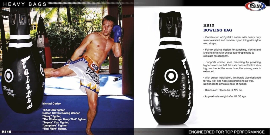 - The Fairtex bowling bag is a great option for gyms and people looking to work their clinch, knee or angles game more effectively. A take on the ‘Teardrop’ design of more conventional boxing brands.Â