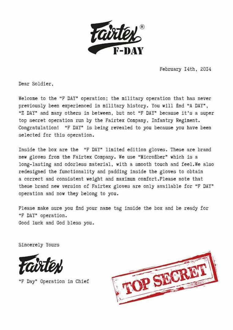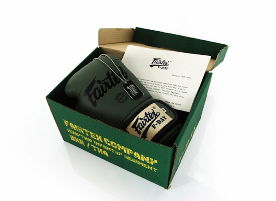 - Comes in a collectors box with a FREE engraved Fairtex Dog-Tag chain necklace and also covering letter explaining the concept behind these gloves and their design.Â