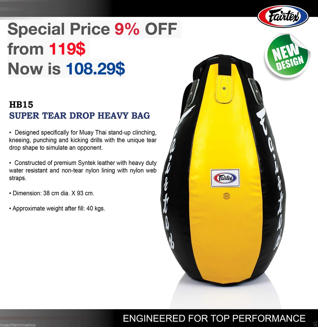 Be the first to review “Fairtex Super Tear Drop Heavy Bag – HB15 (Unfilled) -Great For Working Angles Punching Bags” Cancel reply