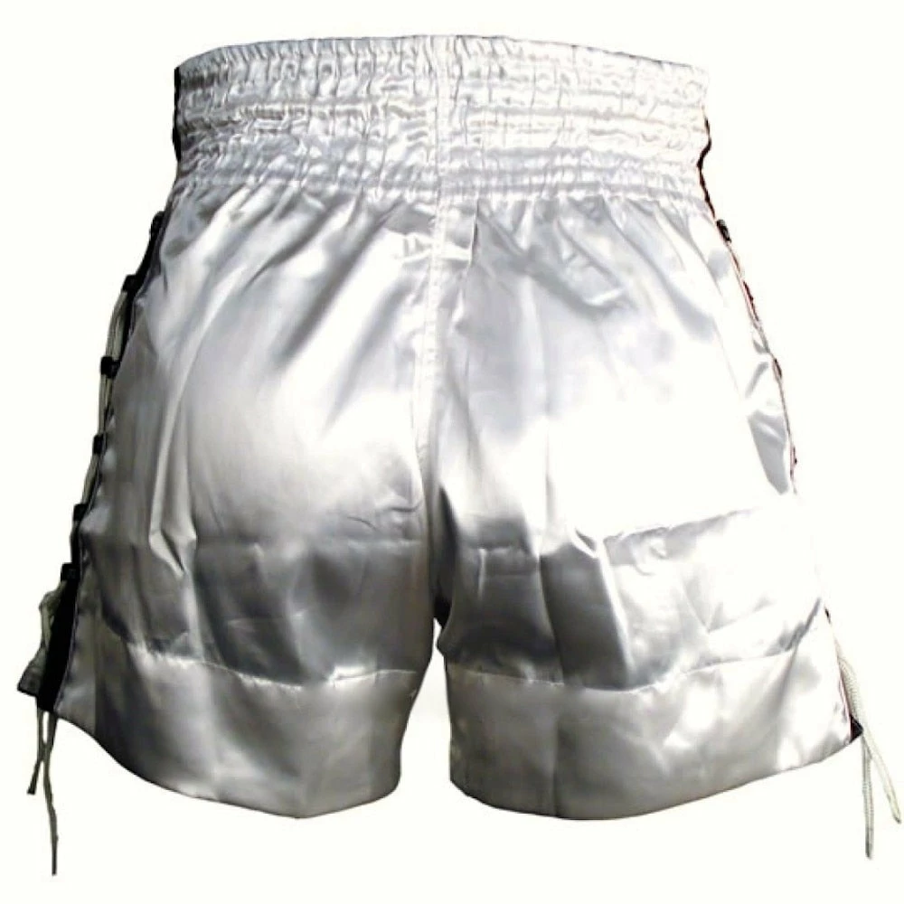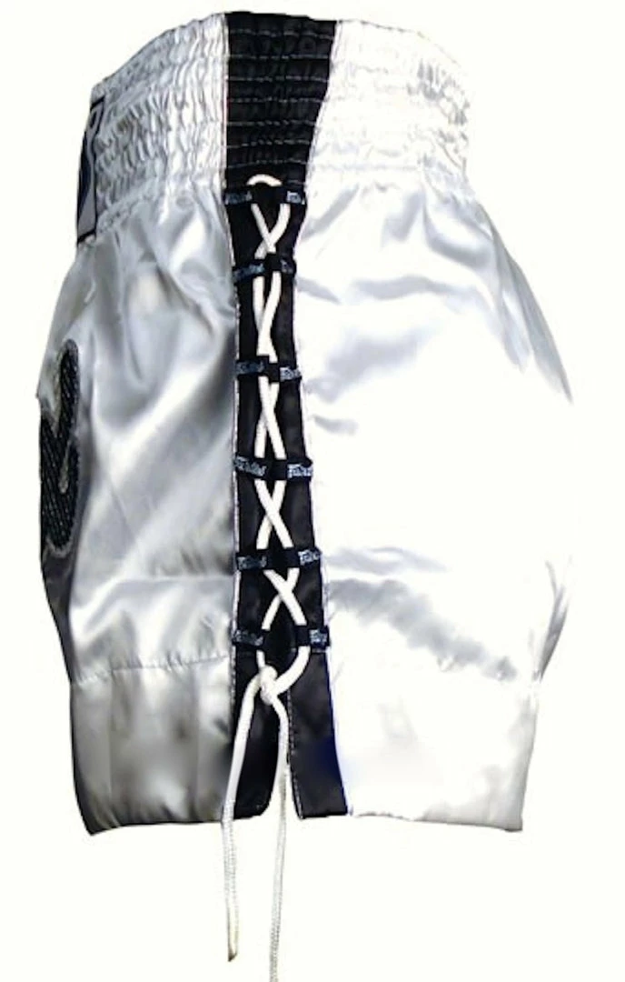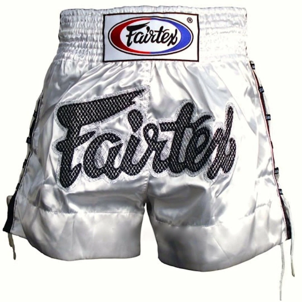 - Fairtex WHITE Laced Sides Muay Thai Shorts are 100% Satin handmade in Thailand and offer a modern take on the standard designs for Thai boxing. With the famous Fairtex logo across the front of the garment; deep waistband and typically excellent quality.