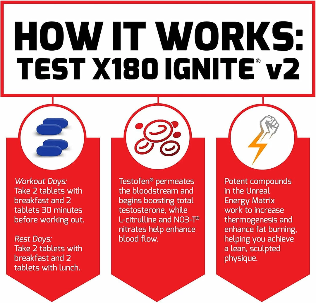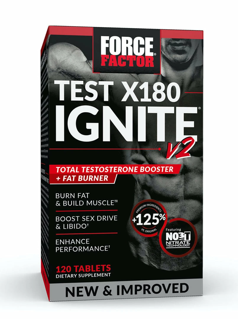 - Introducing Test X180 Ignite, the supplement that delivers more. By combining an enviable total testosterone boost with enhanced fat burning, Test X180 Ignite is designed to give you the spark you need to become more of the man you want to be.