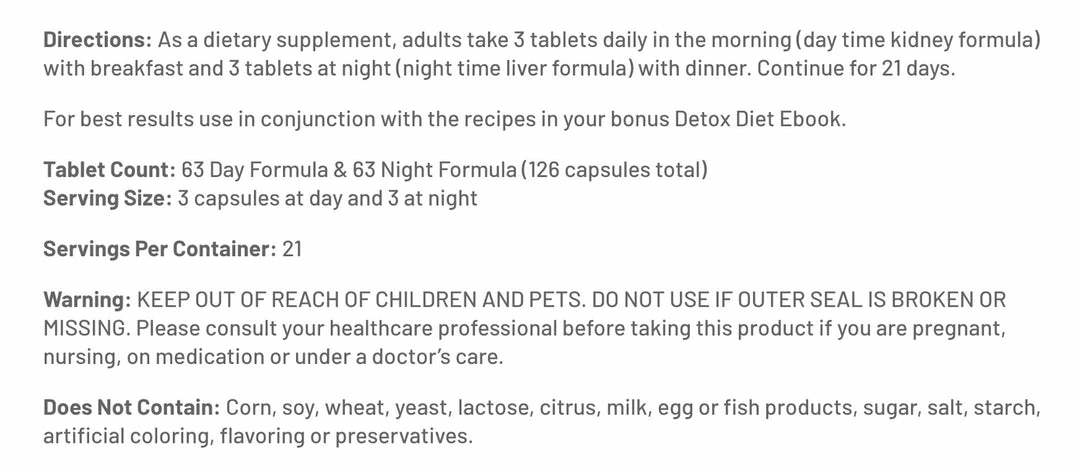 - Detox Complete Day and Night works on Kidneys, Liver and Pancreas. It is a pure natural product with ingredients clinically study which helps the detoxification process at the cellular level.