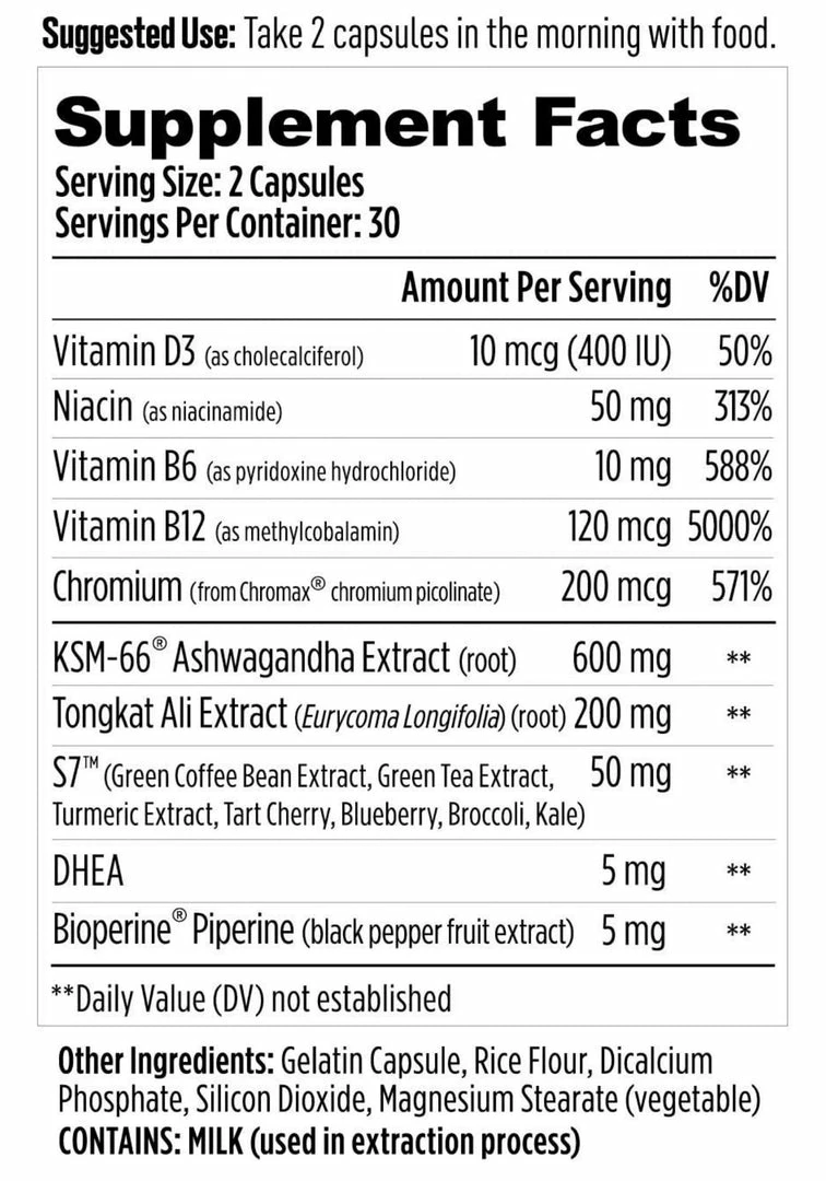 - Powerful Clinically Tested Ingredients, 600mg KSM-66 Ashwagandha, 50mg S7, 200mcg Chromium (from Chromax), 5mg Bioperine, 5mg DHEA per serving