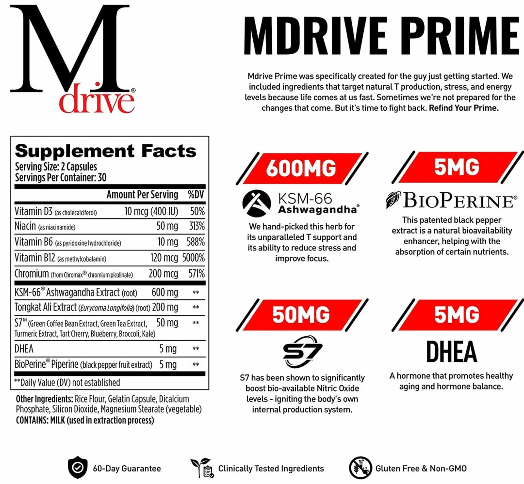 - Mdrive Prime is a men’s daily herbal supplement that was specifically formulated for the starter, supports boosting energy, managing healthy cortisol levels and reducing stress