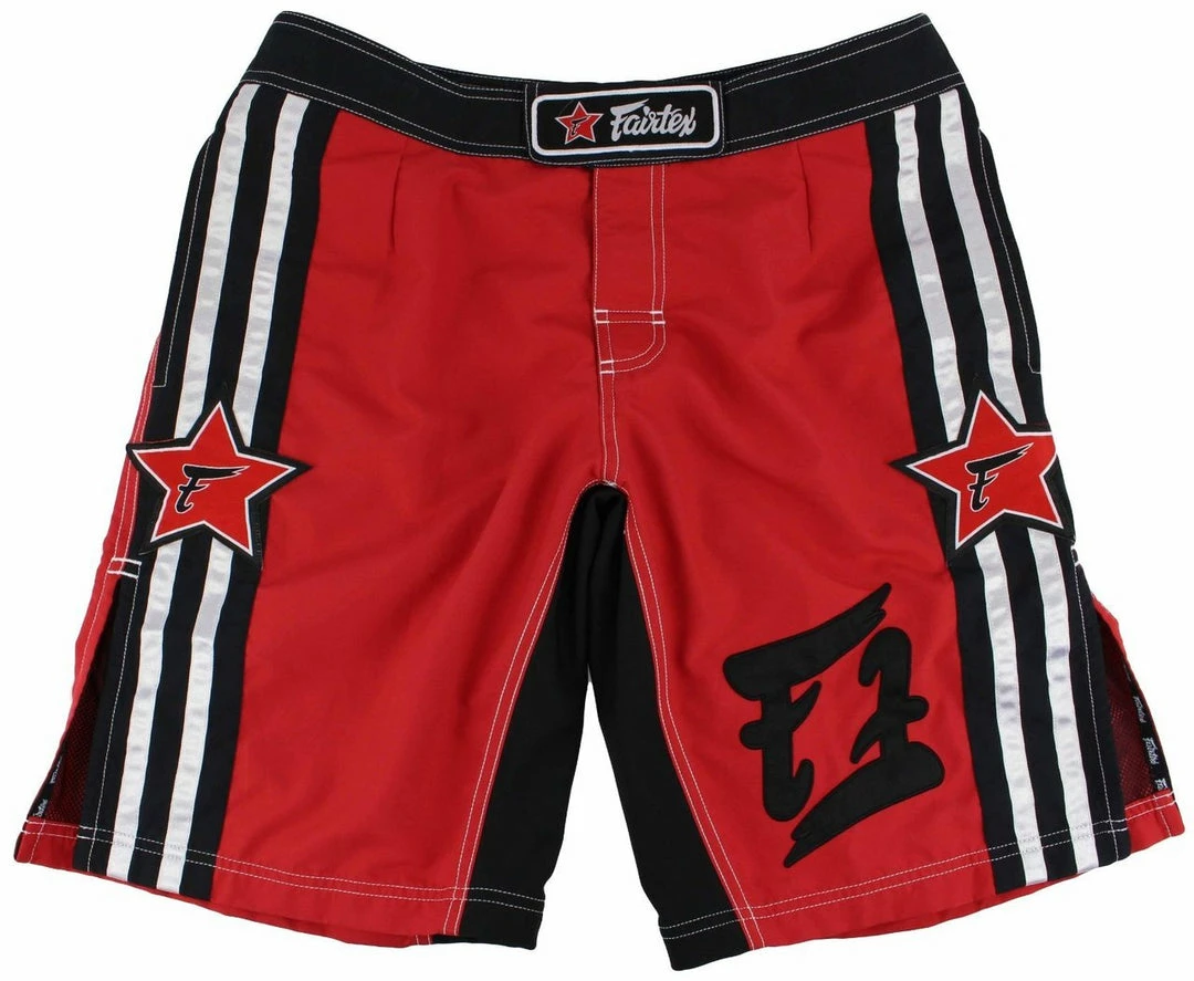 These RED/BLACK Fairtex Boardshorts Features the “Double F” Logo along with the Black and White Stripes and the “DOUBLE F LOGO” on the Left Side The Left and Right Sides feature the Red Fairtex “Star” Logo. Features a Breakthrough for Fairtex MMA Boardshorts because it is the FIRST TIME THAT POCKETS are INCLUDED on each Side. They are handmade in Thailand and offer a modern take on the standard designs for Thai boxing. These MMA Boardshorts are the most comfortable Lightweight shorts around. You are gonna love them. Fairtex has been producing Muay Thai equipment since 1993 and are well known in the sport as a brand who put development and style at the forefront of their products.