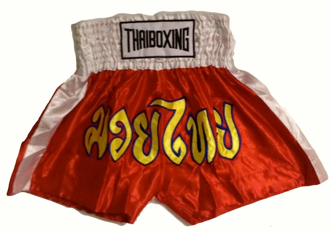 - These RED Muay Thai Shorts are quite Popular in the Muay Thai and Kickboxing world because of their look and comfort. They are RED color and features the brand name “THAIBOXING” on the waist in BLACK color writing and the words “MUAY THAI” written in Thai Language across the middle of the shorts in YELLOW Color.