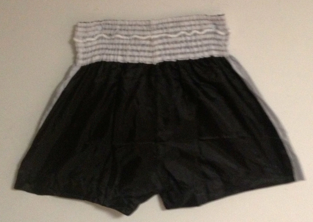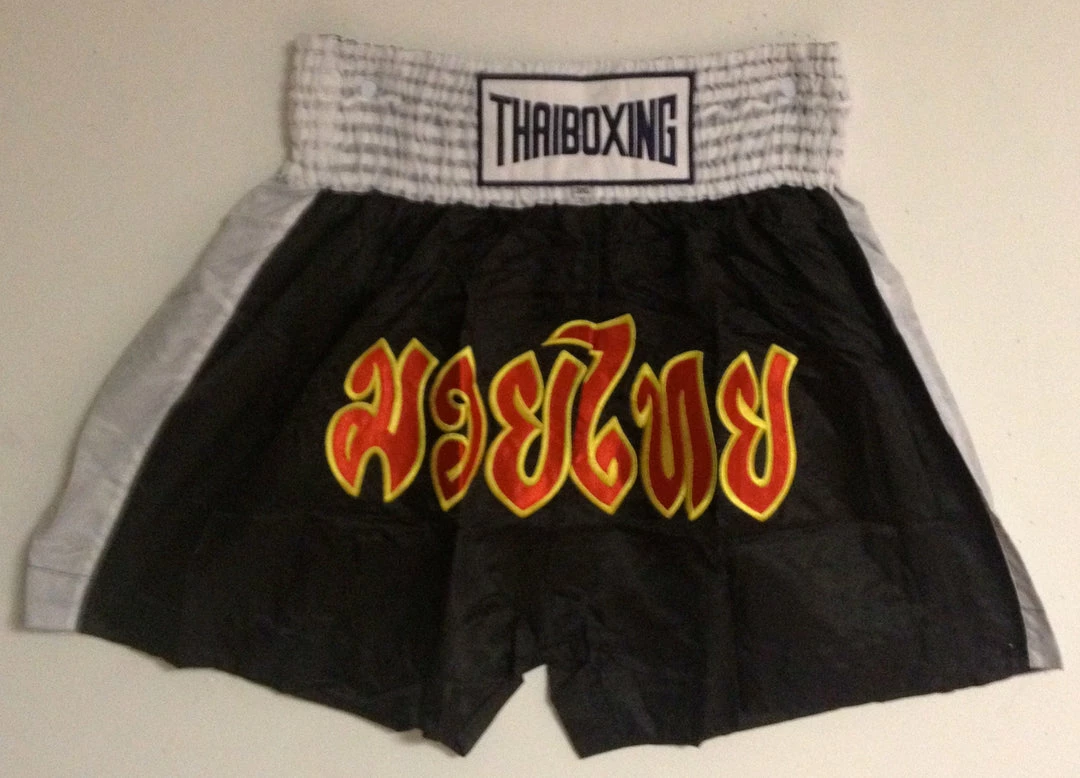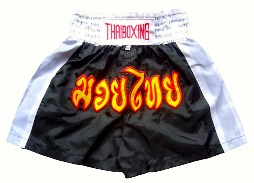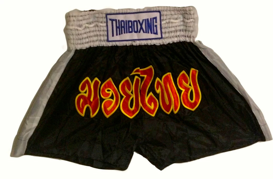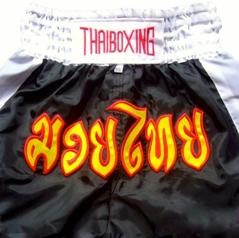 - They are Black and White color and features the brand name “THAIBOXING” on the waist in Red color writing and the words “MUAY THAI” written in Thai Language across the middle of the shorts in Yellow with Red Lining writing.