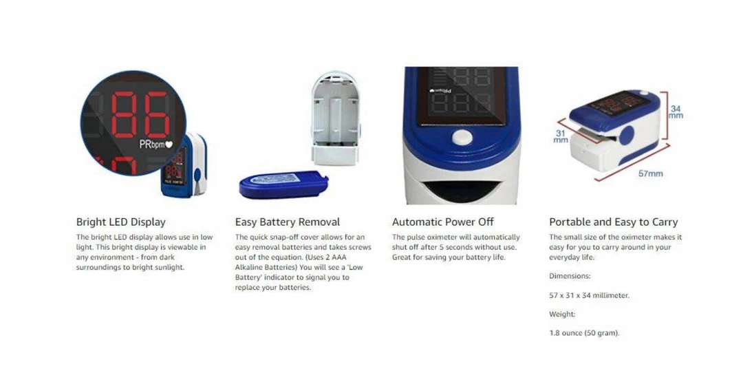 - Includes oximeter, 2 AAA batteries, and a wrist lanyard