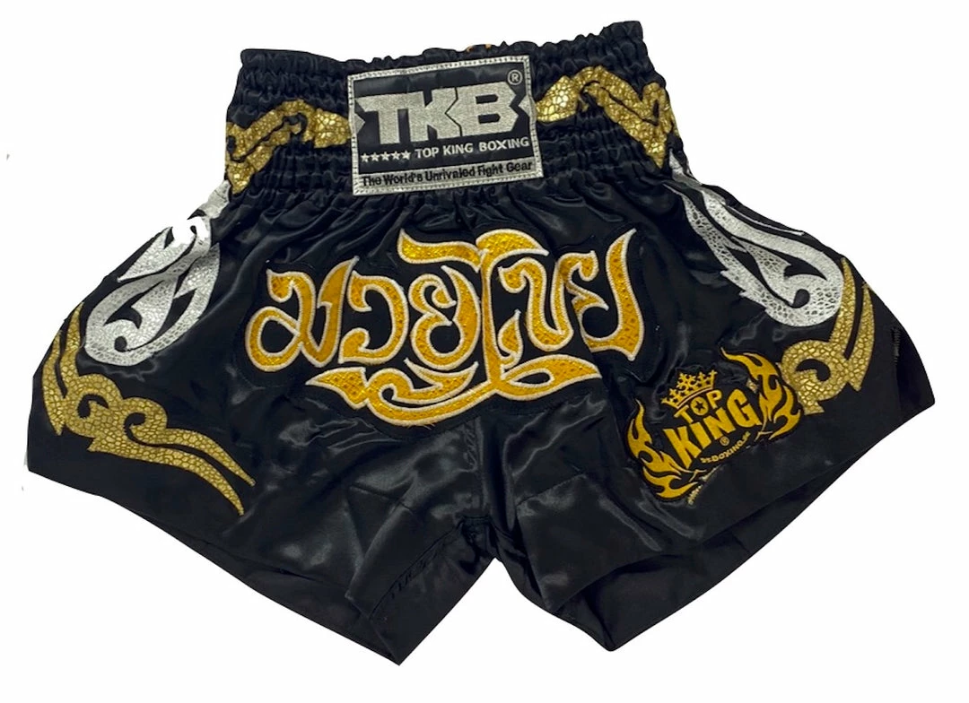 - “TOP KING” logo on the waistband in the middle of the shorts in silver and black.