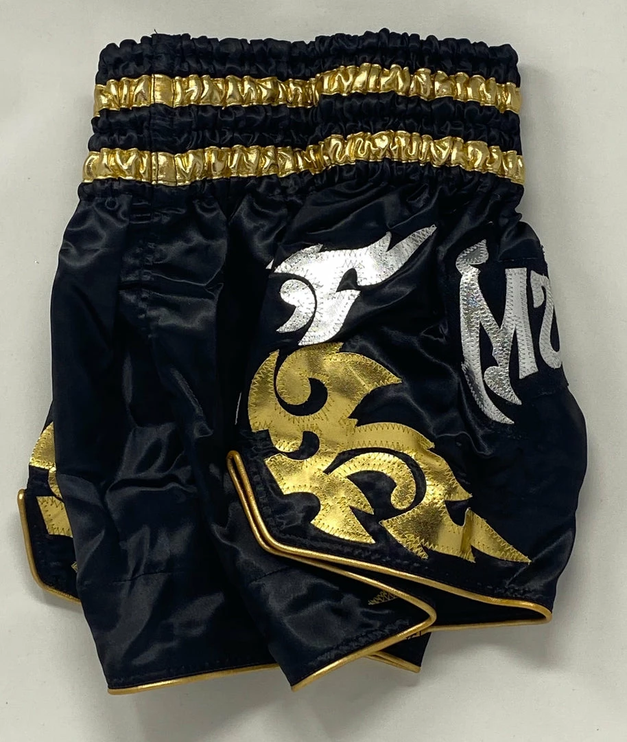 In the MIDDLE of shorts is “MUAY THAI” written across the whole front side of the shorts in Silver Color.